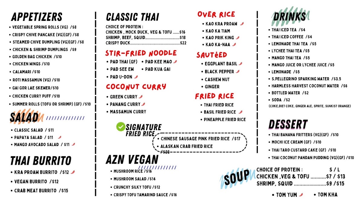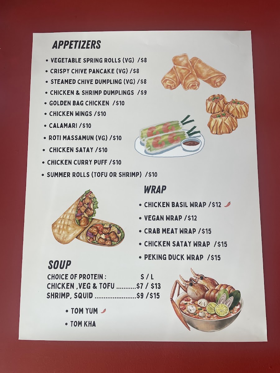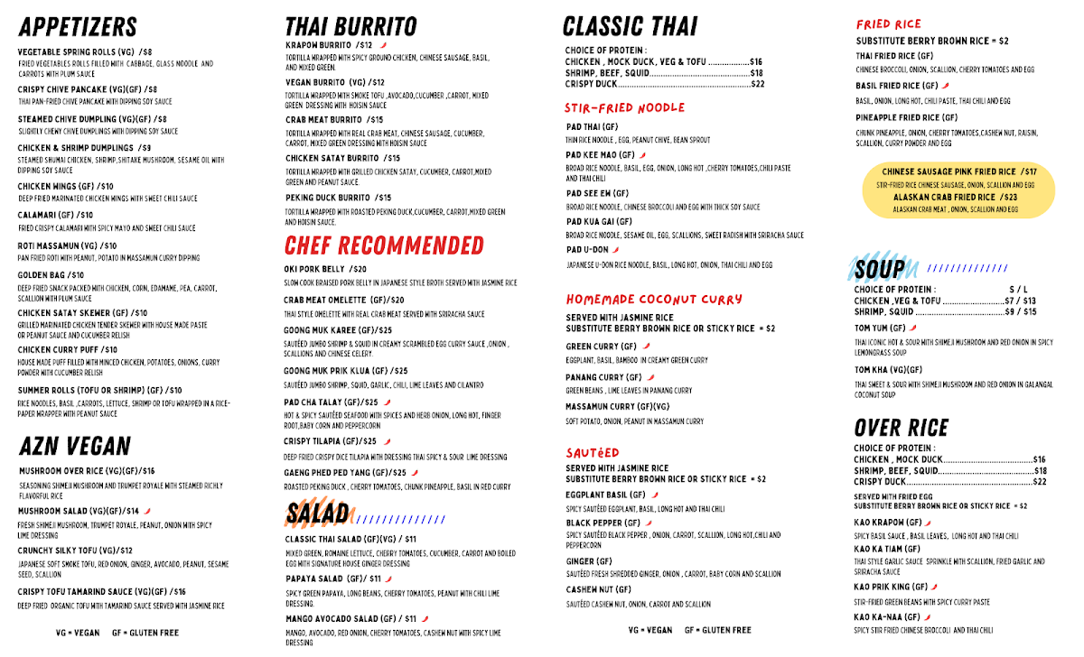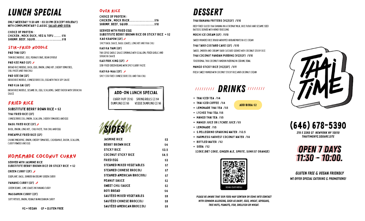 Thai Time offers an extensive menu that caters to a wide range of tastes with its flavorful and diverse dishes. The restaurant’s Value Set ($34.95) is a great option, combining appetizers, main dishes, dessert, and drinks, featuring favorites like T. Basil Fried Rice and T. Pad Kee Mao | Drunken Noodles. For a lighter meal, the Lunch Stir-Fried Noodles options, such as L.Pad Kee Mao | Drunken Noodles and L.Pad Thai Noodles, come with a free salad and drink. The Lunch Fried Rice selections, including L.Thai Fried Rice and L.Pineapple Fried Rice, are perfect for those craving comfort food. Additionally, lunch offerings like L.Green Curry and L.Panang Curry cater to curry lovers. Appetizers range from Vegetable Spring Rolls (VG) to Crispy Chive Pancakes (VG)(GF), while soups like Tom Yum Soup and Tom Kha Soup (VG) provide a warm start to the meal. The chef's recommendations include indulgent choices like Crispy Pork Belly Over Rice and Mama’s Tofu. For a satisfying curry experience, dishes like Panang Curry and Massamun Curry are highly recommended. If you're craving fried rice, options such as Alaskan Crab Fried Rice and Pink Chinese Sausage Fried Rice stand out. Vegan diners can enjoy tasty options like Crispy Tofu Tamarind Sauce (VG) and Sautéed Crispy Tofu And Mixed Vegetables (VG). The dessert menu includes delightful treats like Mango Sticky Rice (VG) and Roti With Condensed Milk. Whether for lunch, dinner, or catering, Thai Time’s menu offers a wide range of vibrant and authentic Thai flavors that will satisfy any palate.